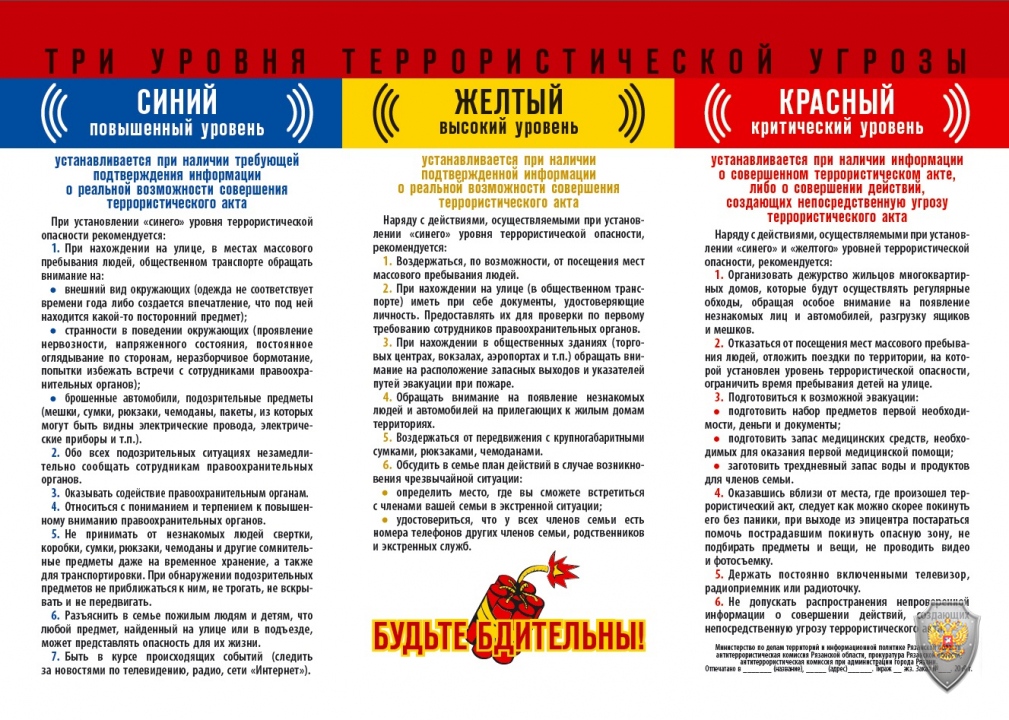 В соответствии с Федеральным законом от 6 марта 2006 г. № 35-ФЗ «О противодействии терроризму» в целях своевременного информирования населения о возникновении угрозы террористического акта и организации деятельности по противодействию его совершению, осуществляемой Национальным антитеррористическим комитетом во взаимодействии с федеральными органами исполнительной власти, органами государственной власти субъектов Российской Федерации, органами местного самоуправления и  в соответствии с указом Президента Российской Федерации от 14 июня 2012 г. № 851 могут устанавливаться уровни террористической опасности, предусматривающие принятие дополнительных мер по обеспечению безопасности личности, общества и государства.