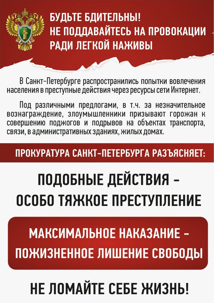 В Санкт-Петербурге участились попытки вовлечения граждан в противоправные действия через интернет (поджоги, подрывы) за незначительное вознаграждение.